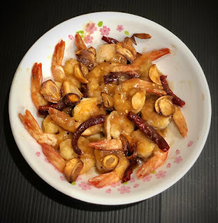 Tonight's Southern Thai Tamarind Prawns (courtesy of Marion Grasby) brought immense delight to hubby. Instead of feeling aggrieved that I only had a small share of the prawns, I was pleased that hubby enjoyed them so much. It was not a difficult dish to prepare either. I chose to peel and devein the prawns, but left the tails intact. They were then marinated with salt and pepper for 30 minutes. To start cooking the dish, I first fried some finely sliced garlic till crispy. These were meant for garnishing. After lightly coating the prawns with cornflour, I shallow fried them and put them aside. Using the fragrant prawn oil, I gave the dried chillies a quick toss before adding the tamarind sauce, which was made up of tamarind puree, fish sauce, brown sugar and cornflour. After the sauce had thickened up, I returned the prawns to the pan to coat them with the glossy aromatic tamarind sauce. Yum!